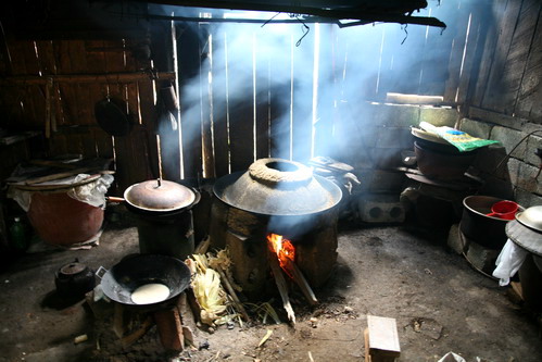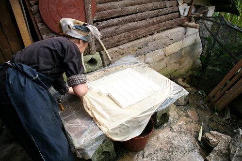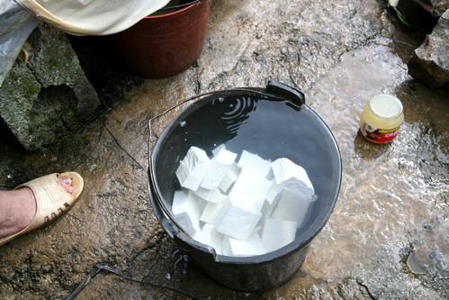 老奶奶说她的孩子都到外地打工了,已经有3年没有回家了。每块豆腐只卖人民币2毛钱。做米酒的大锅