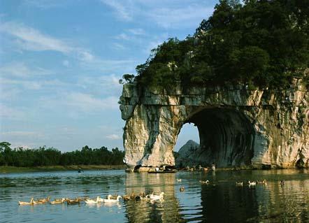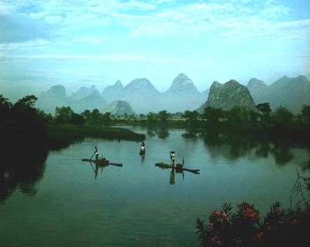 从来都认为乘船在漓江上慢慢漂流才是最有其真趣味的,可惜漓江上往来的机动游船,千篇一律是强迫游客走马观花的。如果为日程宽松的游人安排些人力的木船,象自称“青藤门下走狗”的那位有趣的袁枚袁子才老先生那样,让船在青山顶上缓行,细数江中游鱼,那是多好!