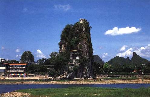 伏波山左边是靖江王城里的独秀峰。南朝刘宋景平二年,颜延之来到桂林任始安太守,常在峰南麓读书,“未若独秀者,峨峨郛邑间”,至今桂林仍有他的名篇刻石《五君咏》。徐霞客来的时候,曾经多次上书,请求进入王府登上此峰,为此还特意在桂林勾留经月,但终未如愿,郁郁而去。